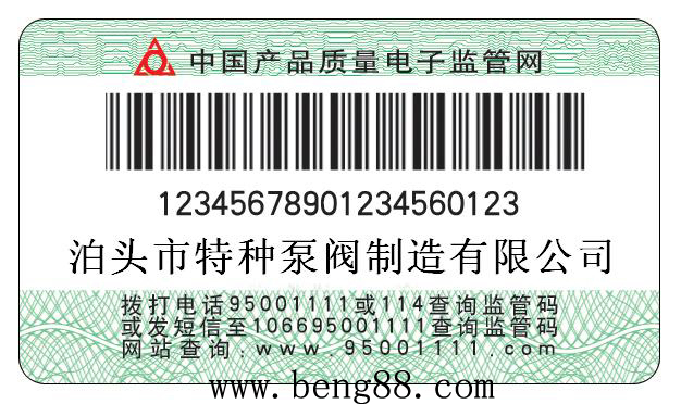 泊頭市特種泵閥制造有限公司自2008年5 月1 日出廠的產(chǎn)品,在產(chǎn)品合格證上粘貼長(zhǎng)方形監(jiān)管碼標(biāo)簽,上有20位數(shù)字,這就是產(chǎn)品監(jiān)管碼。因此,我公司生產(chǎn)的每件產(chǎn)品都將有一個(gè)“電子身份證”。可以利用固定電話、手機(jī)短信、互聯(lián)網(wǎng)、超市終端等網(wǎng)絡(luò)通訊設(shè)備對(duì)電子監(jiān)管碼進(jìn)行查詢,辨別真?zhèn)?。查詢辦法如下: