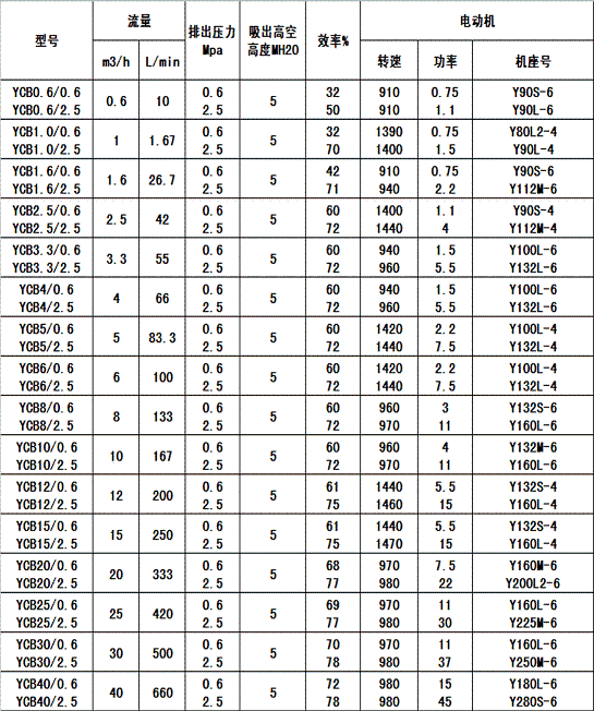 YCB型系列圓弧齒輪泵性能參數(shù)表